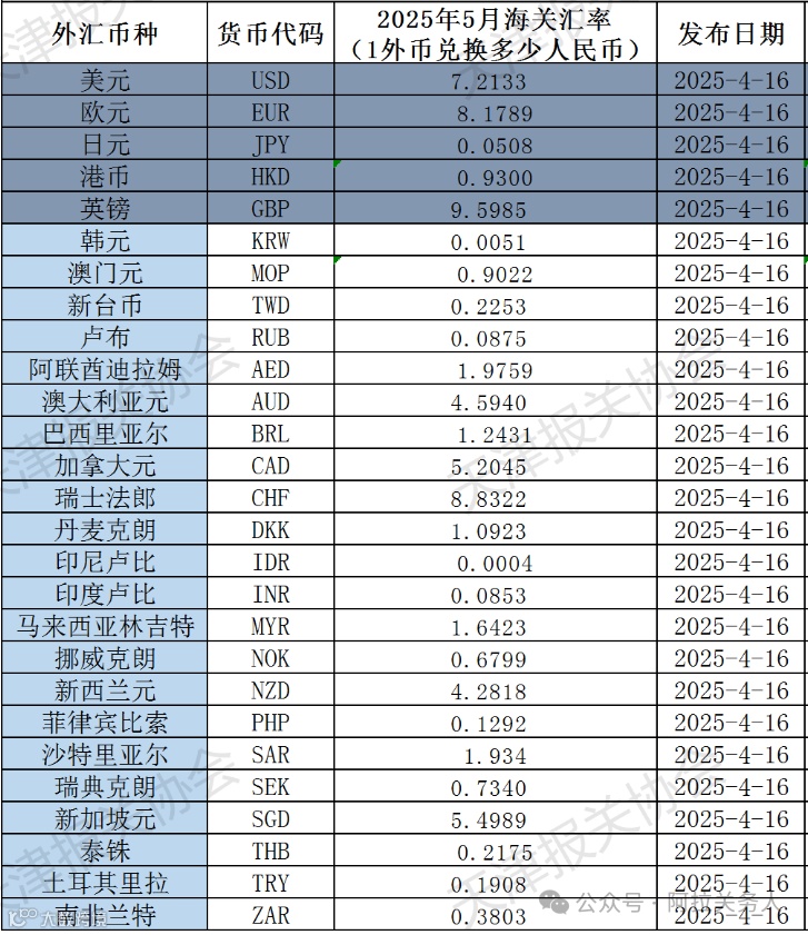 2025年5月适用汇率表