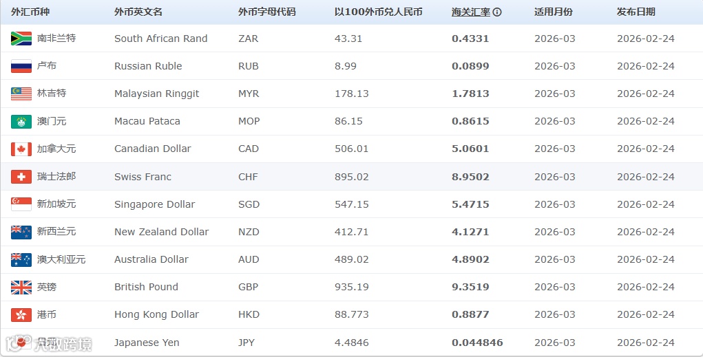 2026年3月适用汇率表