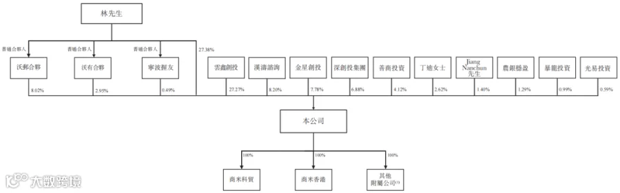 商米科技采用同股不同权(A/B股)架构,创始人林喆为实际控制人,直接持股27.38%,持有高投票权A类股,合计控制79.04%投票权。