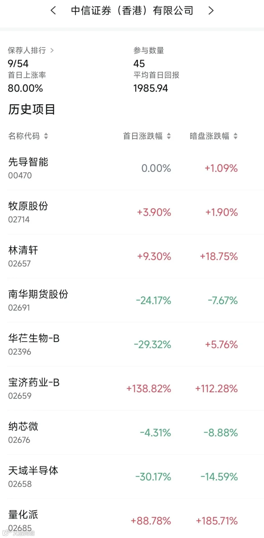 在中信证券近2年保荐的港股项目中,首日上涨率为80.00%,平均首日回报1985.94港元。