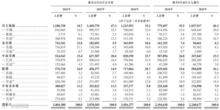 按区域划分,2025年前三季度收入占比分别为:亚太地区46.3%、欧洲26.1%、中南美洲15.5%、中东及非洲7.9%、北美洲4.6%。