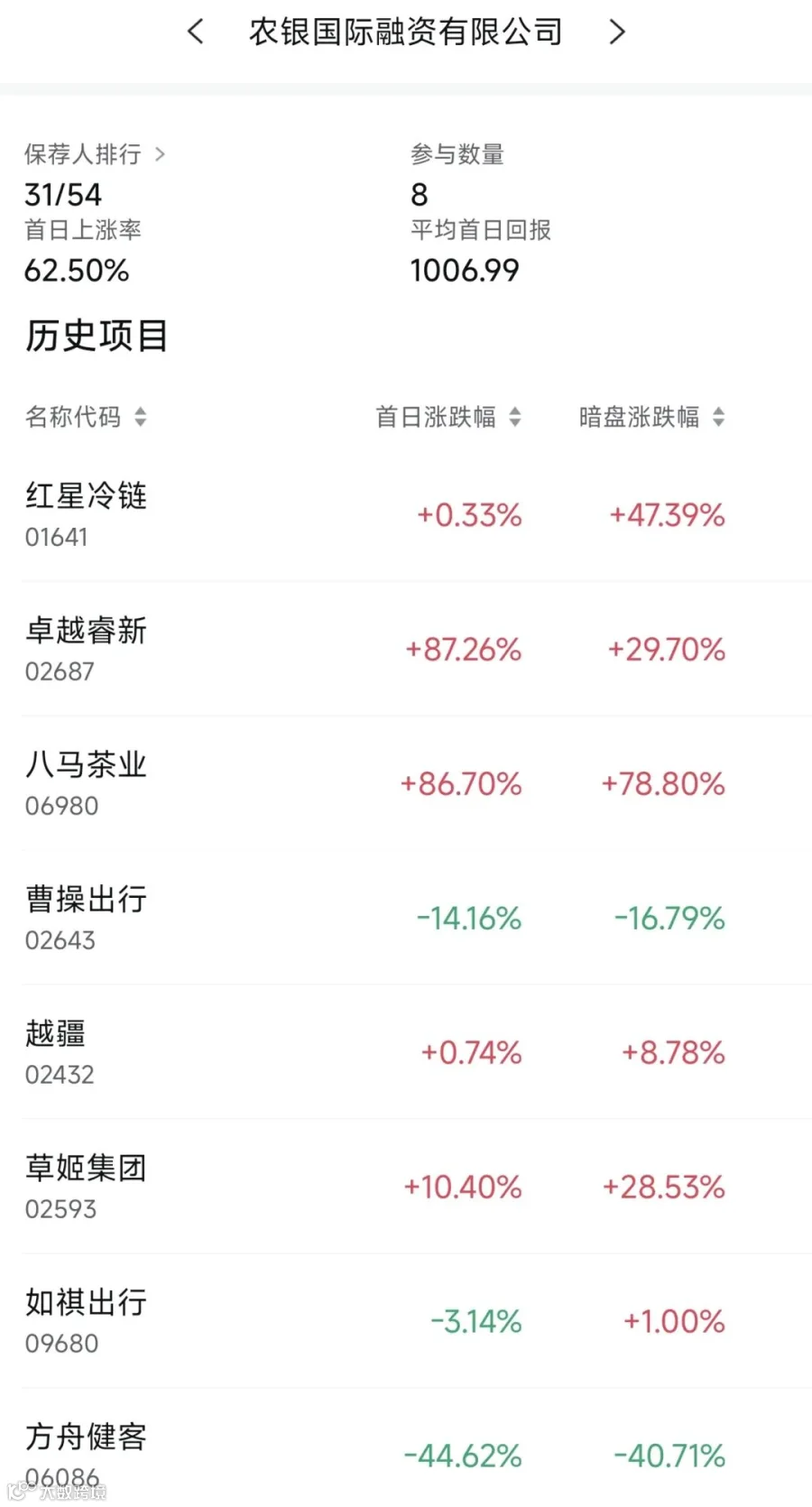 在农银国际近2年保荐的港股项目中,首日上涨率为62.50%,平均首日回报1006.99港元。