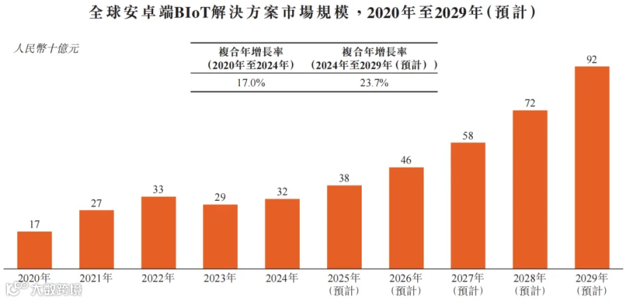 据灼识咨询数据,全球安卓端BIoT解决方案的市场规模持续增长,从2020年的179亿元增至2024年的320亿元,复合年增长率为17.0%,后续预计将以23.7%的速度增至2029年的920亿元。