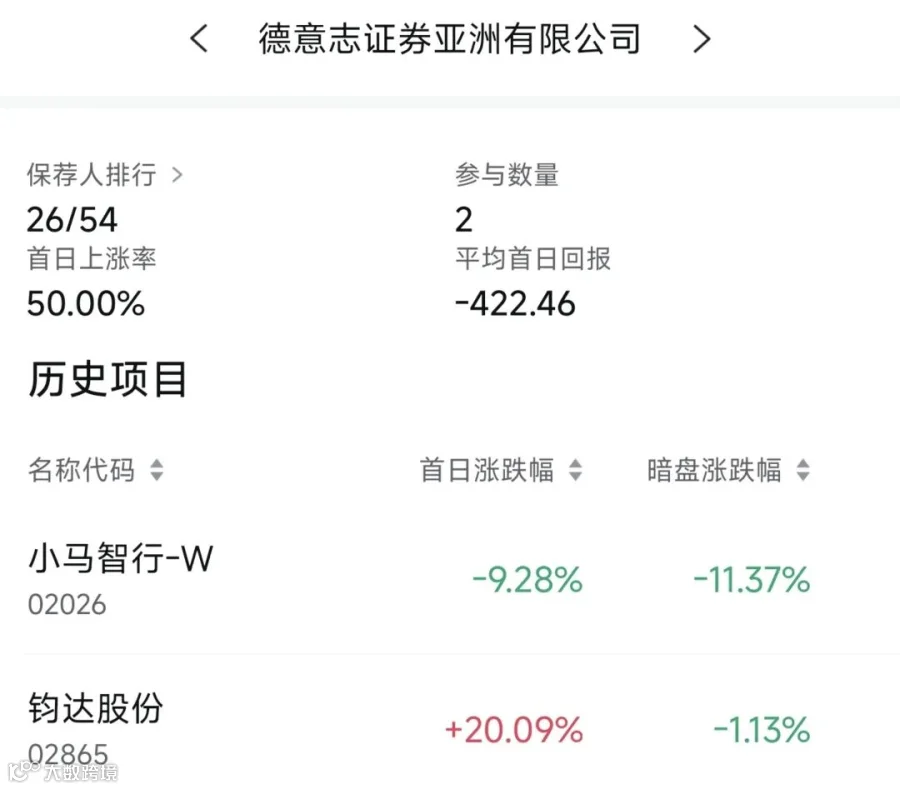 在德意志证券近2年保荐的港股项目中,首日上涨率为50.00%,平均首日回报-422.46港元。