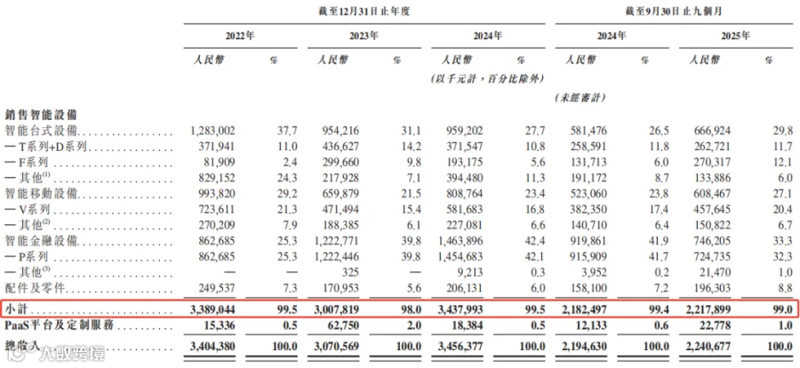 按收入类型划分,公司的绝大部分收入来自销售智能设备,于2025年前三季度约占当期收入的99.0%。