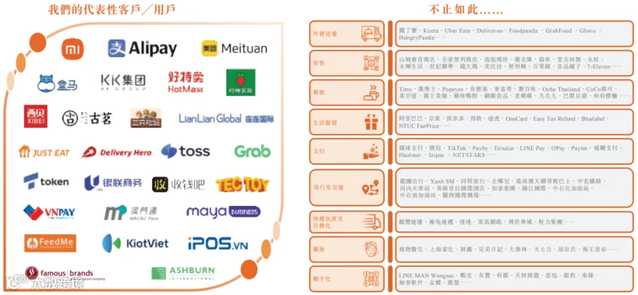 同时,据同一资讯来源,商米科技已服务全球前五十大食品及饮料企业中超过70%的公司。在中国,公司已实现超过70%的餐饮百强企业覆盖率及超过60%的百强连锁商店覆盖率。另外,公司的客户还包括全球领先零售及电商企业(如山姆会员店、全家便利店、泡泡玛特、阿里巴巴、京东及拼多多),以及领先的外卖平台(包括Glovo、Uber Eats、Keeta及Foodpanda)。截至2024年底,全球前十大外卖平台中有七家采用公司的解决方案。下图为公司的部分代表性客户/用户。