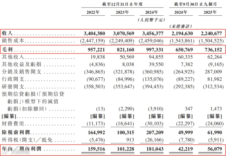 而公司的毛利也是类似的情况,从2022年至2024年,分别为9.6亿元、8.2亿元及10.0亿元,对应的毛利率分别为28.1%、26.7%及28.8%。2025年前三季度的毛利为7.3亿元,同比增长13.1%,对应的毛利率为32.8%。