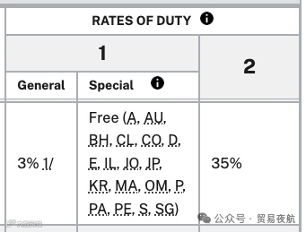 - “General”栏显示基础税率,若右侧带“/”符号(如“3%/”),表示存在附加关税,需点击跳转至第99章(Chapter 99)进一步核查;