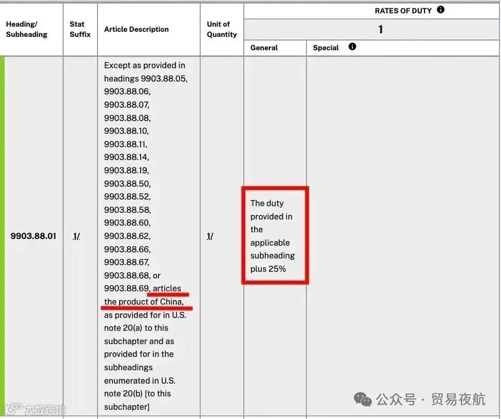 - 第99章中明确标注“articles the product of China”的条目,即为中国加征关税项,如“+25%”,即在基础税率上叠加25%;