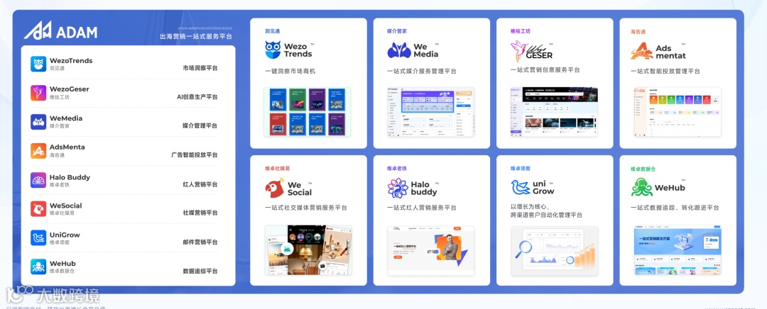 - 八大产品:覆盖流量采购、内容生产、广告投放、媒介管理、数据洞察、红人服务、社媒运营、智能创意,打造出海数字营销全链路生态闭环。