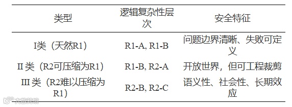 - R3(非递归可枚举):既无法事前判定安全,也无法通过枚举事后发现错误。属∀未来 + ∀反事实问题(即对所有未发生但逻辑上可能发生的情形,某性质必须成立)。R3目前仅为理论假设,一旦出现即不可解决,因人类将丧失恢复控制权的能力。其现实作用是作为“禁止条件”,约束当前设计而非治理对象。