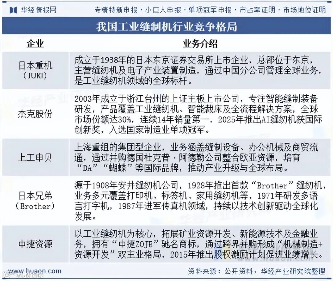 全球市场集中度较高,日本重机、杰克科技等头部企业在技术、品质与渠道方面优势显著。我国缝制机械产业已建成全球最大、最完善的工业体系,部分国产整机品牌技术性能接近国际先进水平,整体竞争格局保持稳定。