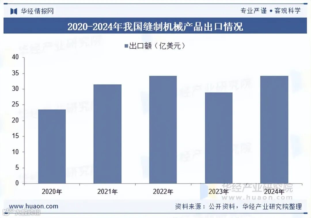 2024年,全球经济稳步复苏,发达经济体补库需求释放,南亚、东盟、非洲、拉美等区域市场回暖明显,越南、印度、柬埔寨、巴基斯坦、埃及、巴西等地鞋服生产与出口恢复性增长,带动中国缝制机械出口回升。海关总署数据显示,全年出口额达34.24亿美元,同比增长18.39%。