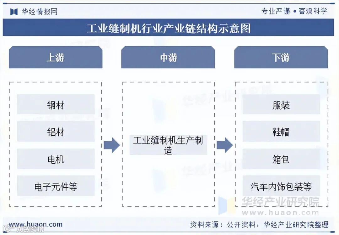 上游涵盖钢材、铝材、电机、电子元件及缝纫机针、压脚、旋梭等精密零部件;中游为整机研发制造,聚焦高速、高精度、自动化与物联网集成技术;下游面向服装、鞋帽、箱包、汽车内饰等应用领域,并通过经销商、电商平台及售后服务网络实现终端覆盖。