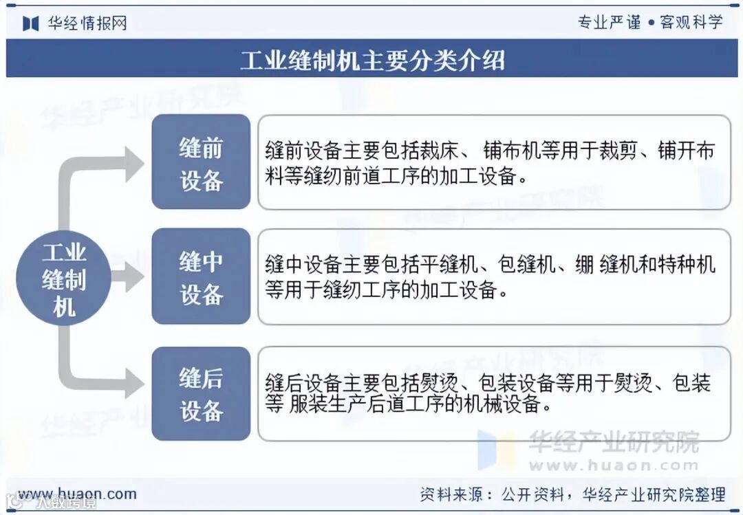 工业缝制机械是服装、箱包、鞋帽等行业的核心生产设备,按工艺流程分为三类:缝前设备(如裁床、铺布机)、缝中设备(如平缝机、包缝机、绷缝机、特种机)和缝后设备(如熨烫、包装设备)。