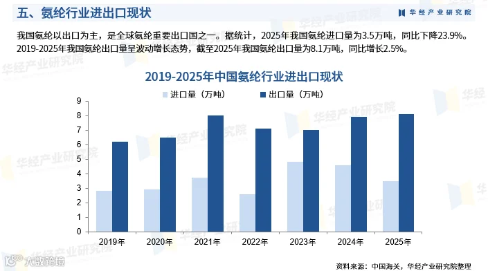 我国是全球重要氨纶出口国。2025年氨纶进口量3.5万吨,同比下降23.9%;出口量8.1万吨,同比增长2.5%,2019—2025年整体呈波动上升态势。
