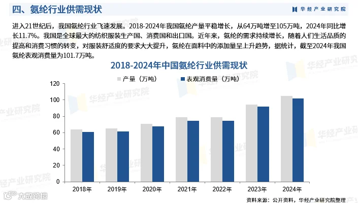 2018—2024年,我国氨纶产量由64万吨增至105万吨,2024年同比增长11.7%。作为全球最大的纺织服装生产国、消费国和出口国,氨纶在功能性面料中的应用持续扩大。2024年我国氨纶表观消费量达101.7万吨。