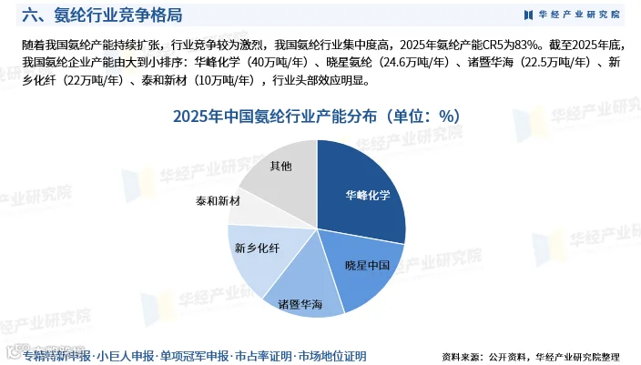 2025年氨纶行业CR5达83%。主要企业产能排名为:华峰化学(40万吨/年)、晓星氨纶(24.6万吨/年)、诸暨华海(22.5万吨/年)、新乡化纤(22万吨/年)、泰和新材(10万吨/年)。