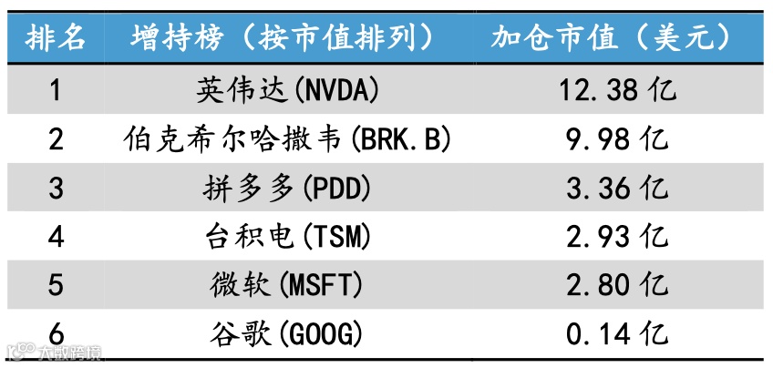 本季度段永平最显著的动作是向AI赛道和核心中概股发起“冲锋”。英伟达(NVDA)获其大手笔增持12.38亿美元,市值跃升至组合第三位(7.72%)。同时,他继续加码拼多多(PDD),增持3.36亿美元,使其稳居第四大重仓。