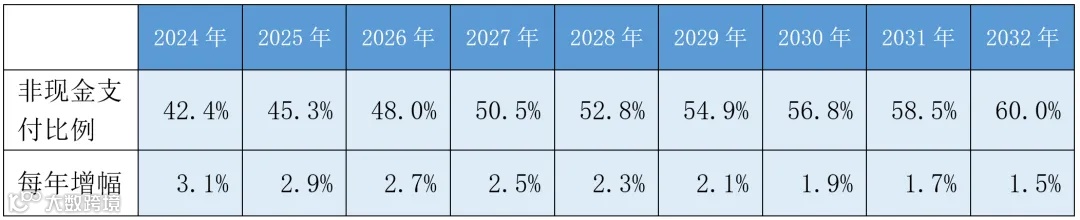 表1 2024年至2032年日本非现金支付比例每年增幅预测