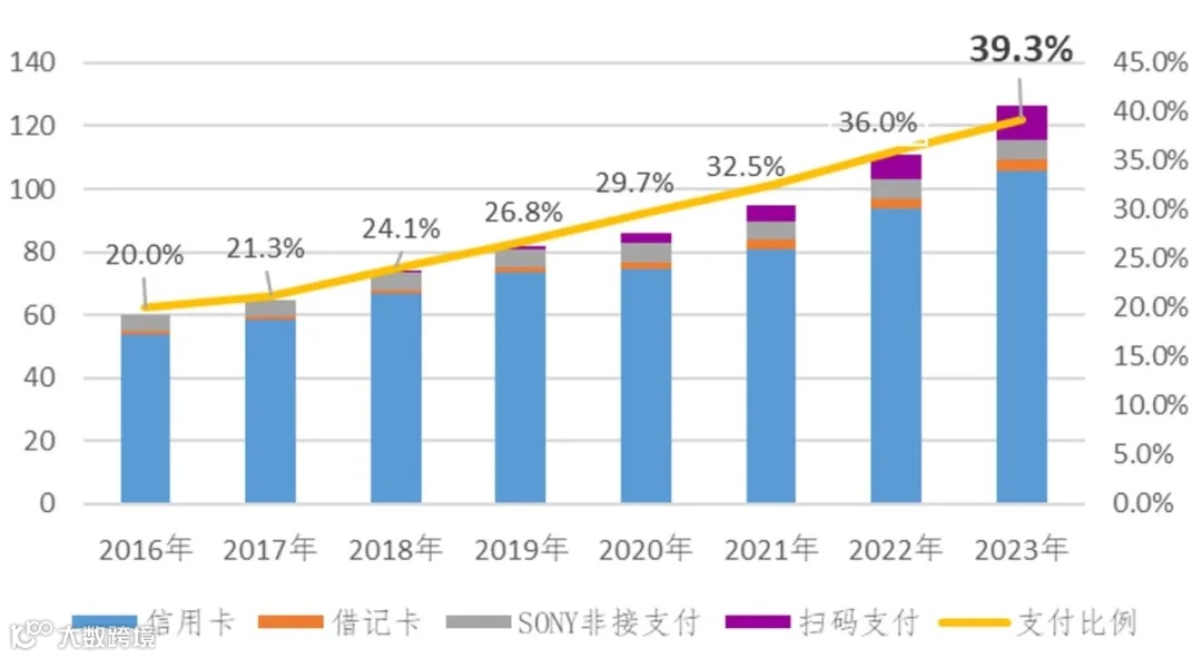 在应用场景中,Visa等国际卡品牌联合信用卡公司在地铁公交等交通非接场景攻城略地,以求替代以JR西瓜卡为主的Sony非接交易,但规模仍远未形成。PayPay为主的扫码支付在跨境支付上开始有所作为,但主要以吸引其他国家扫码钱包进入日本为主,而日本扫码钱包的出境尚未启动。本文就2023年日本支付的最新数据展开详细分析。