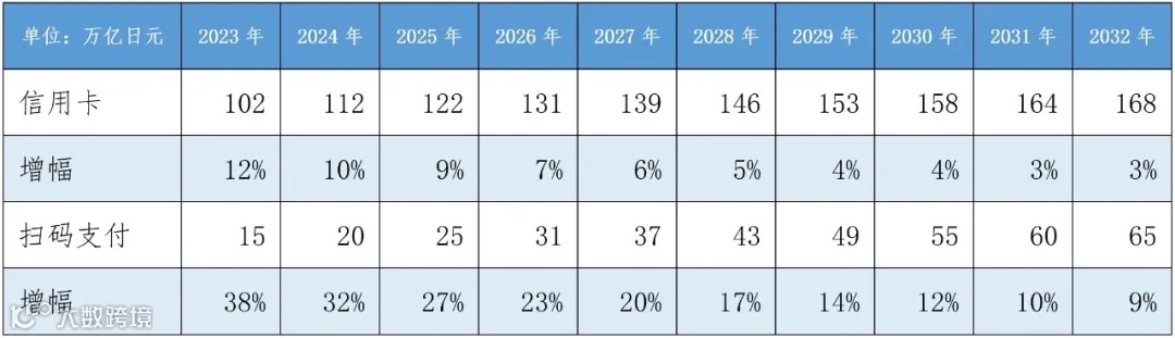 表3 2023年至2032年日本信用卡和扫码支付增幅