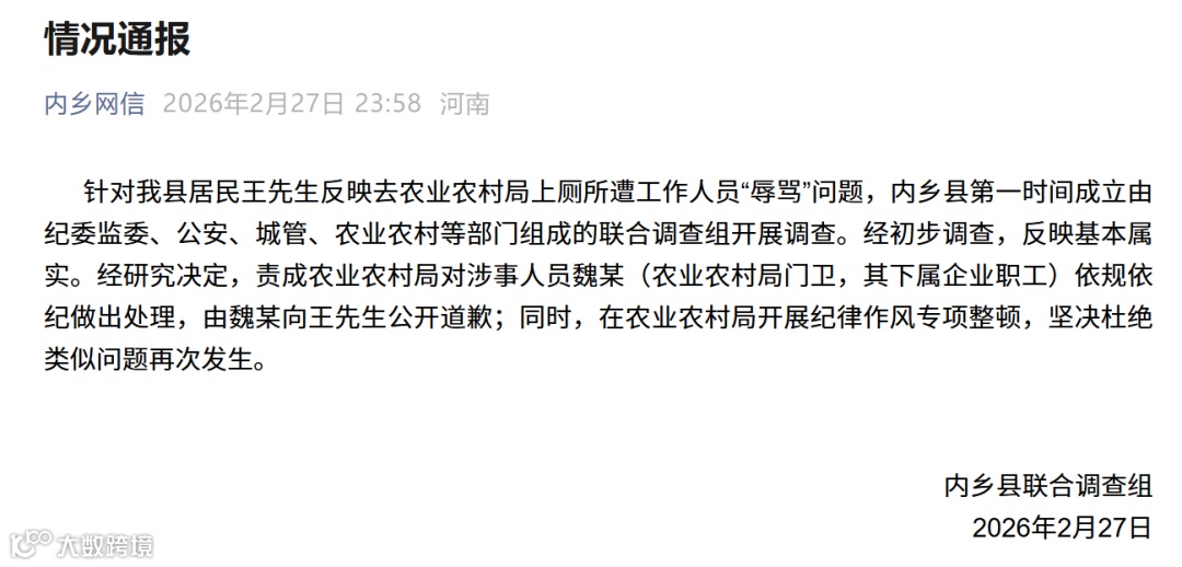 2月27日晚,河南省内乡县联合调查组发布情况通报: