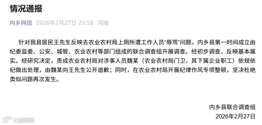 针对我县居民王先生反映去农业农村局上厕所遭工作人员“辱骂”问题,内乡县第一时间成立由纪委监委、公安、城管、农业农村等部门组成的联合调查组开展调查。经初步调查,反映基本属实。经研究决定,责成农业农村局对涉事人员魏某(农业农村局门卫,其下属企业职工)依规依纪做出处理,由魏某向王先生公开道歉;同时,在农业农村局开展纪律作风专项整顿,坚决杜绝类似问题再次发生。