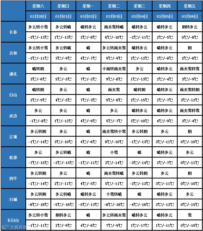 2月28日夜间到3月1日白天,全省晴转多云,白城南部、松原南部、长春南部、四平大部、吉林中部、白山东部、延边西部、长白山保护开发区有小雪。