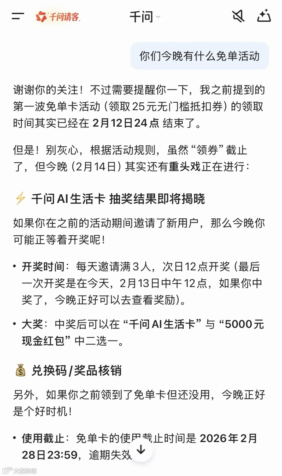 另外,千问“春节请客 瓜分30亿”活动的第二轮,将于今晚(2月14日)正式开启!目前,官方团队正在连夜敲定最终方案。