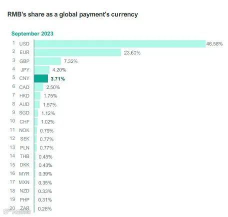 2023年9月,在基于金额统计的全球支付货币排名中,人民币保持全球第五大最活跃货币的位置,占比升至3.71%,这一值再创历史新高,上个月该值为3.47%。更早之前的最高点为2022年1月的3.20%。