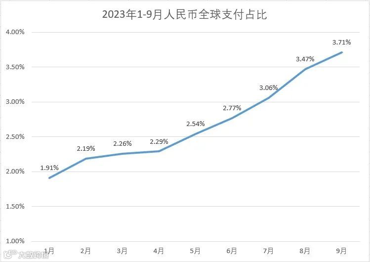 2023年1~8月的人民币全球支付占比分别是1.91%、2.19%、2.26%、2.29%、2.54%、2.77%、3.06%、3.47%。今年以来,人民币全球支付占比持续8个月保持增长态势。3.71%这一新高点,相对于今年1月的1.91%,数值几近翻倍。