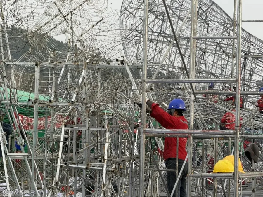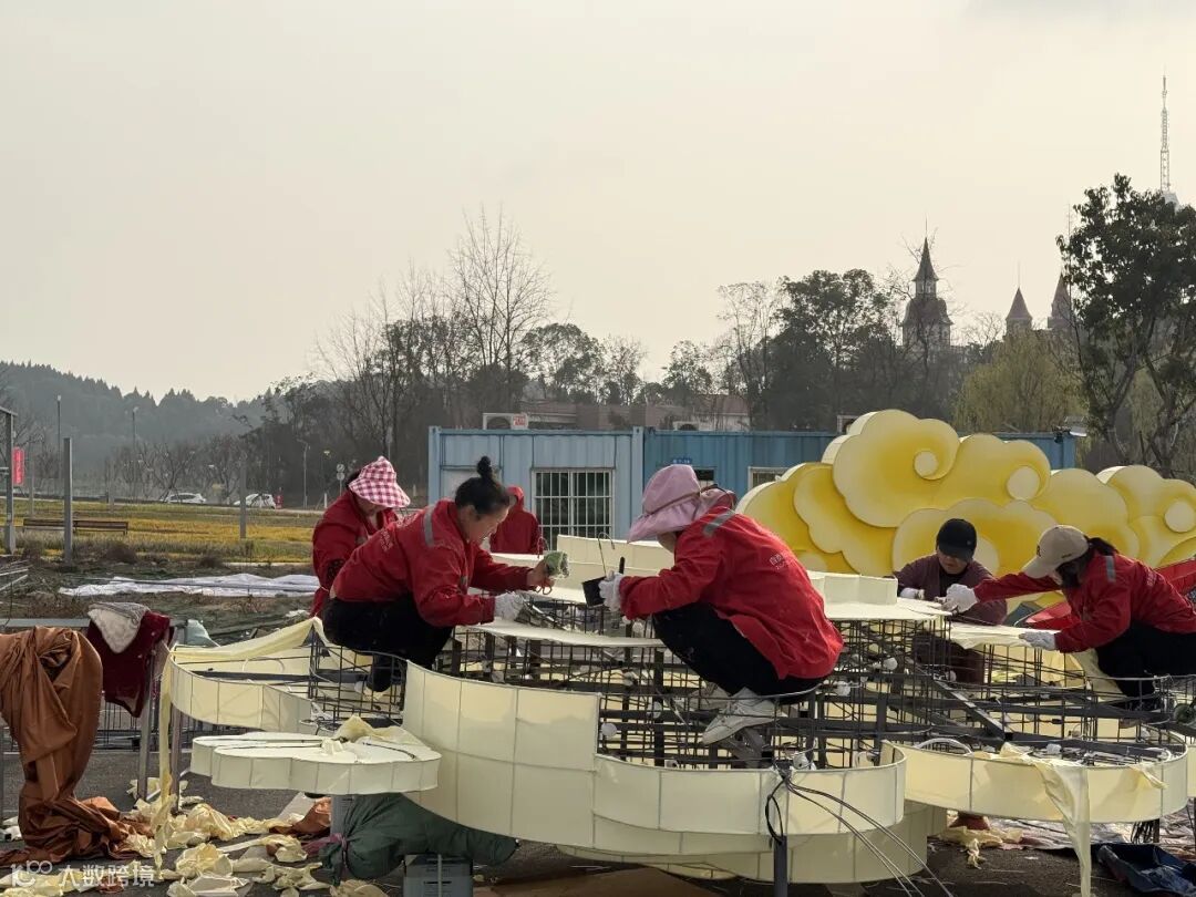 施工现场,焊花点点,光影交错。200余名工匠正轮班进行焊接、美工与裱糊,为大型灯组披上流光溢彩的“新衣”。一座座巨型钢架拔地而起,彩灯轮廓逐渐清晰,一场融合古蜀神韵与现代光影的艺术盛宴正徐徐揭开面纱。