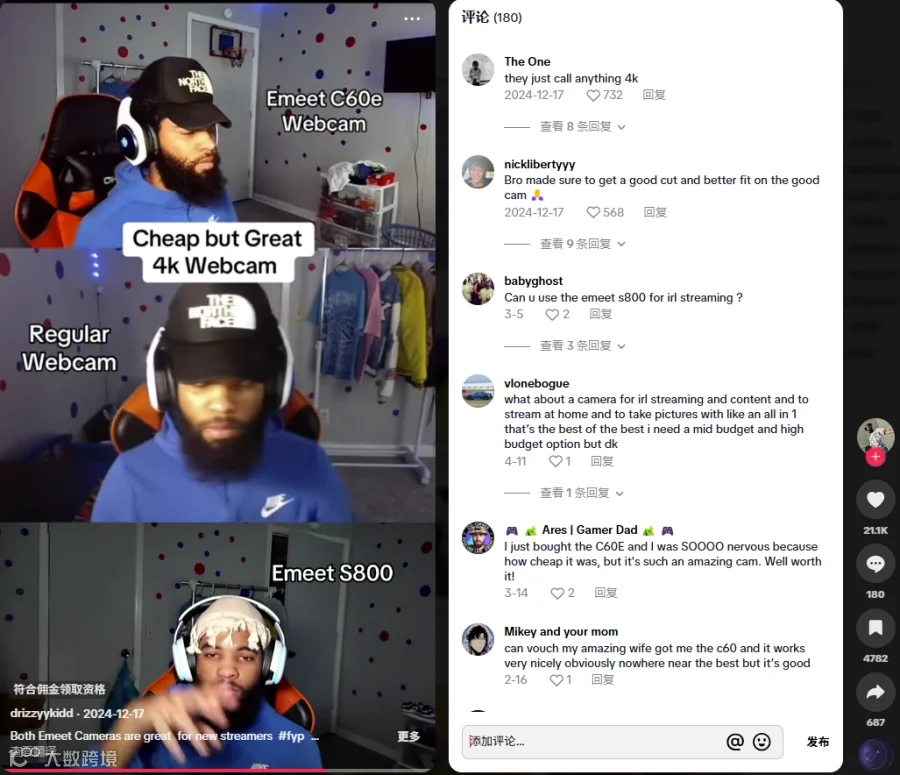 他在视频中巧妙设计了产品比实验,将EMEET的两款摄像头与一款未透露品牌的普通摄像头进行同框对比拍摄,通过三屏分镜的直观展示方式,让观众清晰看到不同设备在画质、色彩还原度等方面的性能差异,增强内容可信度,更通突出EMEET产品的技术优势。