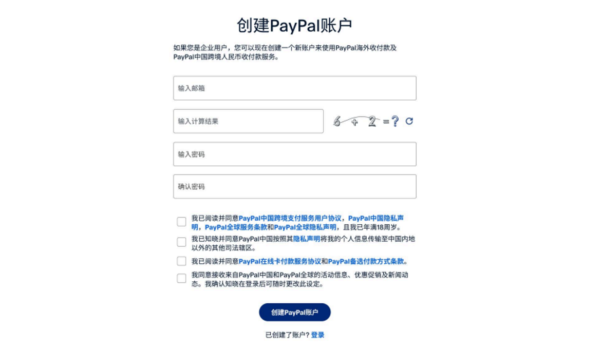 填入邮箱地址和密码,邮箱会收到验证码,填入验证码完成验证即可完成PayPal账户创建,进入企业入驻流程。