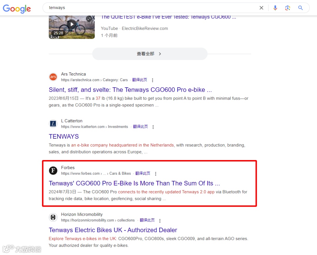 谷歌输入Tenways,首页即呈现出Forbes的测评内容,文章同样对其E-bike产品给予了高度评价,进一步缩短了潜在用户的决策时长。