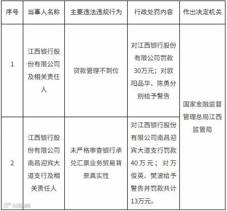 其中,因贷款管理不到位,江西银行被罚30万元,相关责任人欧阳品华、陈勇被警告;因未严格审查银行承兑汇票业务贸易背景真实性,江西银行南昌迎宾大道支行被罚40万元,相关责任人万俊英、樊波被警告并罚款共计13万元。