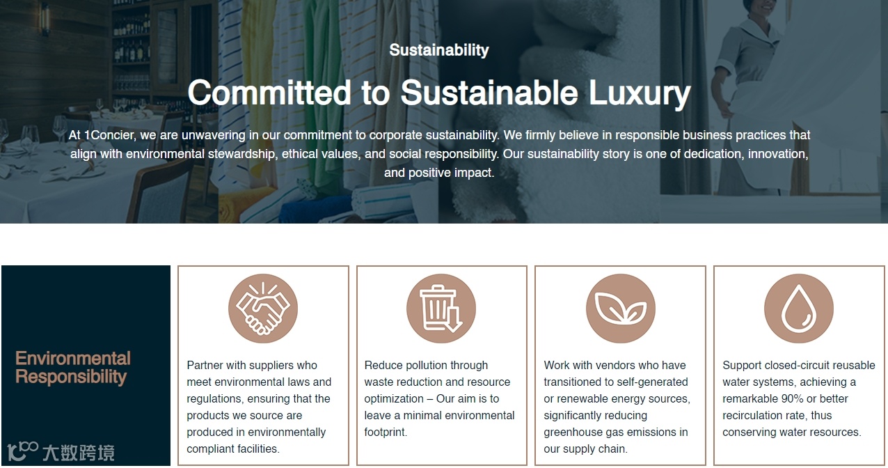 可持续:环保价值观正逐步影响B端客户的选择倾向,尤其是中高端酒店、邮轮、医疗等重视品牌调性与ESG表现的客户。1 Concier不是单纯喊口号,而是围绕着环保供应链、节能生产、水资源节约等维度具体展开,形成完整的“可持续故事”,并通过平实的语言、明确的数据,在其官网描绘了“减碳减污”的实际行动。