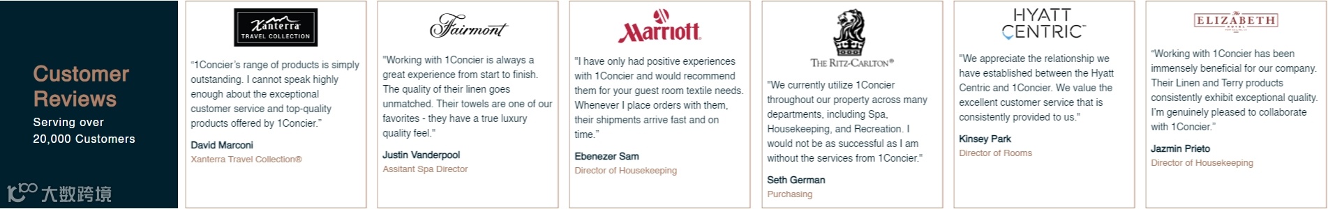 1 Concier在首页设置了专门的客户评论展示区域,集中呈现来自国际知名酒店品牌的真实使用反馈。这些评价不仅包含用户的姓名、职位及所属企业等详细信息,还覆盖了客房、采购、清洁等多个职能部门,增强了内容的可信度与多维度代表性。通过这种方式,1 Concier是能够有效传达行业权威背书,从而进一步提升潜在客户的信任感与成交意愿的。