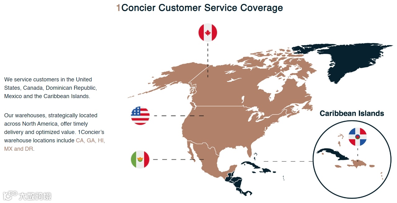 1 Concier在首页直接列出覆盖区域,同时清晰展现其在北美各地的仓储布局,以地图+文字形式,强调“本地仓储支持+快速交货能力”。这种布局不仅解决了客户对“能不能供,多久能供”的疑问,也大大降低了因距离带来的不安,是有助于提升询盘率的。