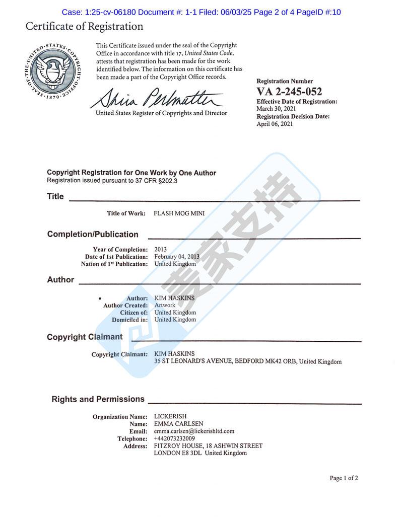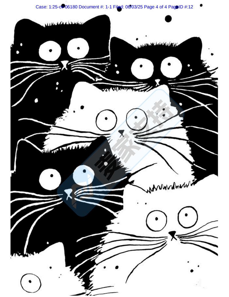 本案是Keith律所6月首起全新版权维权案,代理原告Kim Haskins 针对其在美国注册的版权作品发起的维权。经卖家支持排查发现,Kim Haskins 在美国共注册有42个版权,本次维权的作品版权号为:VA 2-245-052,是一张黑白可爱猫咪插画,跨境卖家需注意全面排查并下架高风险链接,并警惕该品牌方的持续维权!