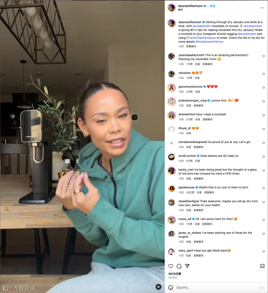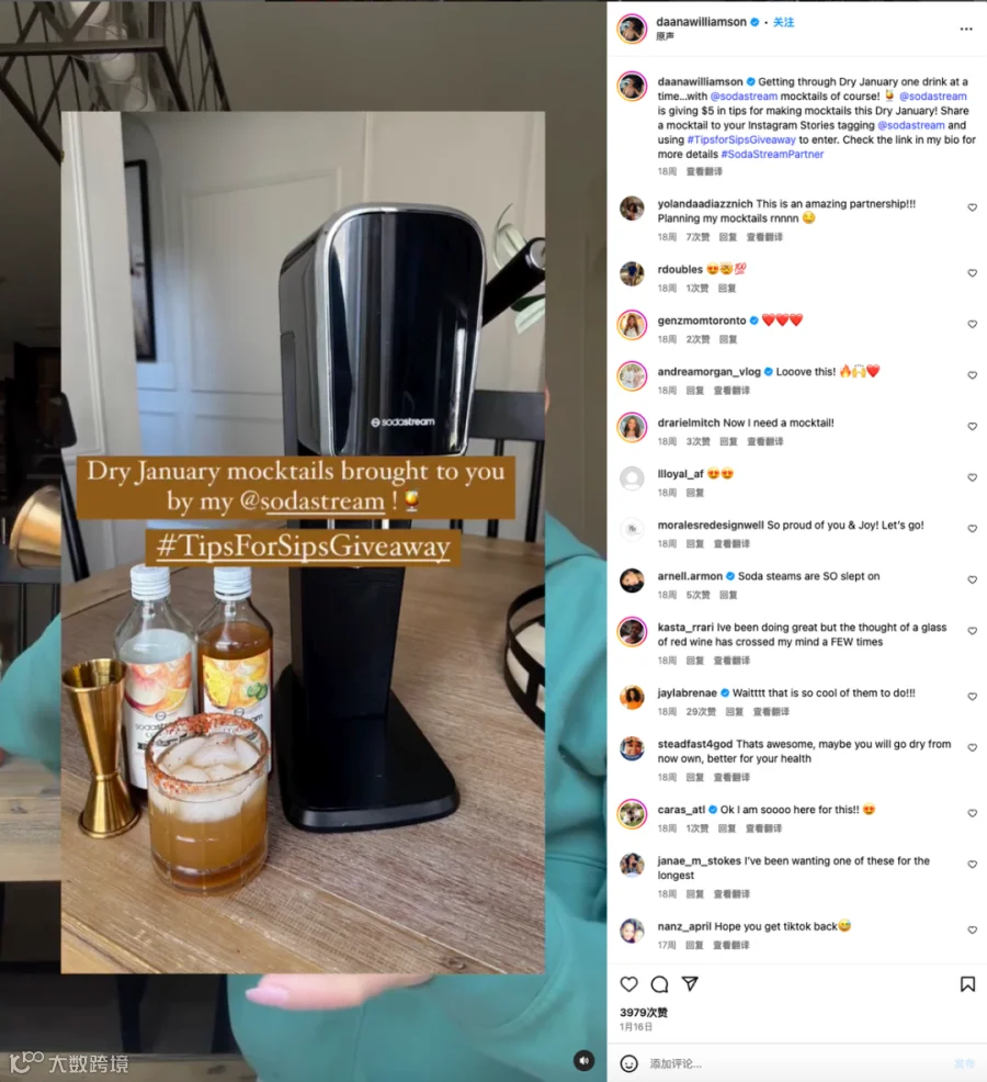 最终,这条合作帖文收获了16.8万的播放和3979次点赞,数据反馈还是很不错的,这毕竟是一条较硬的推广视频。值得一提的是,Williamson不仅在帖文的正文处指明了SodaStream的官号地址,还留下了很有诱惑力的折扣信息,并号召粉丝和路人参加品牌设立的#TipsforSipsGiveaway活动来赢得奖品。