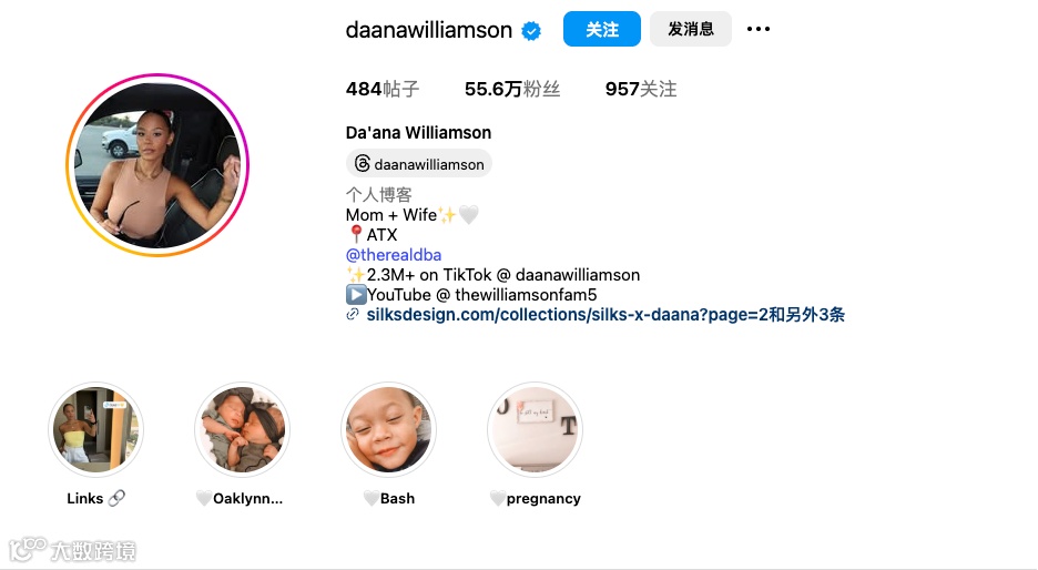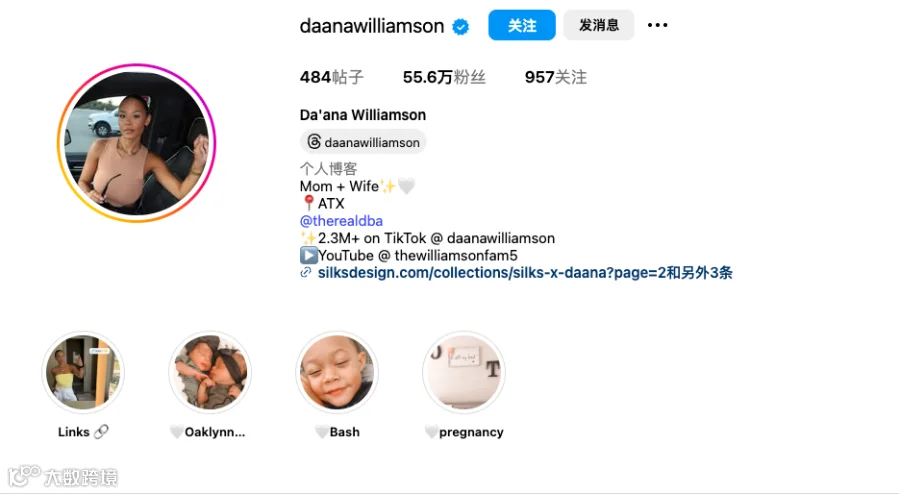 Da'ana Williamson,一位活跃在各大主流社媒平台的LifeStyle博主,以“妈妈+妻子”的身份为核心进行内容创作。目前Instagram账号拥有55.6万的粉丝关注,其中绝大多数都是年龄在25–40的女性为主。