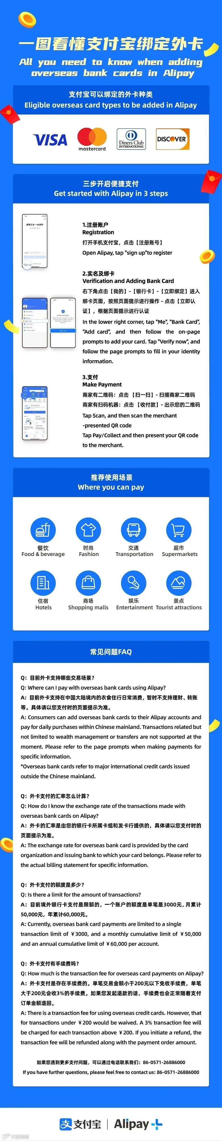 现在,境外用户来到境内下载支付宝,可以绑定自己的境外发行信用卡,无需换汇,就能在城市乡镇、大街小巷畅享便捷的数字支付体验。不仅可以买买买,还可以点外卖、坐公交、骑单车、用支付宝买门票看比赛,甚至还能去蚂蚁森林种树。