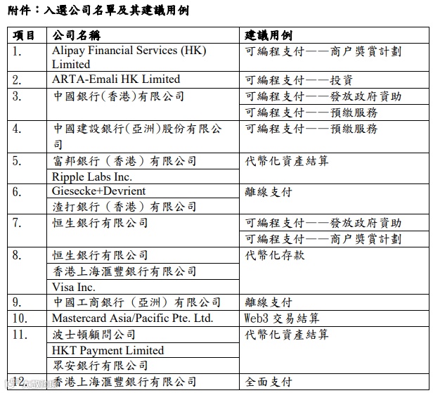 在本次“先导计划”中,16家来自金融、支付和科技领域的入选公司将于今年内进行首轮试验,深入研究数字港元在六个范畴的潜在应用案例,包括全面支付、可编程支付、离线支付、代币化存款、第三代互联网(Web3)交易结算和代币化资产结算。