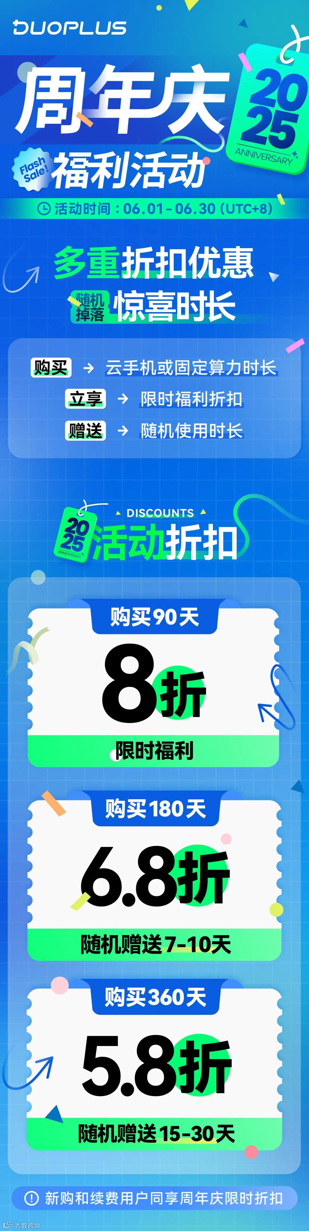 为了真诚感谢一直关注DuoPlus的新老用户,我们在6月1日特别推出周年庆活动,多重超值折扣,还有最多30天使用时长免费送!错过这次优惠,再等一年!锁定DuoPlus官方渠道,优先抢购!