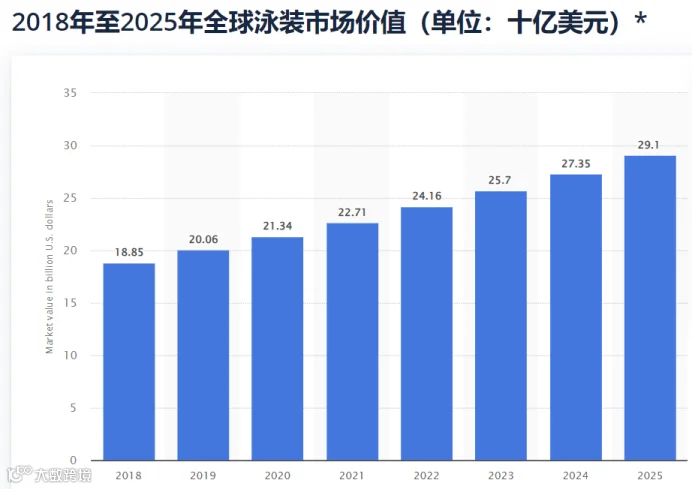 Statista数据则显示:到 2025 年,全球泳装市场规模将增至 291 亿美元左右,表明了对泳装市场更乐观的预测。