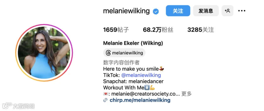 Melanie因与姐姐共同运营TikTok账号“威尔金姐妹”而积累了超过300万粉丝,后以个人身份继续活跃于社交平台,分享健身训练、健康饮食、穿搭风格及日常生活等内容。她的影响力覆盖多个垂直领域,包括健身、时尚、生活方式等,使其成为品牌理想的跨界合作对象。