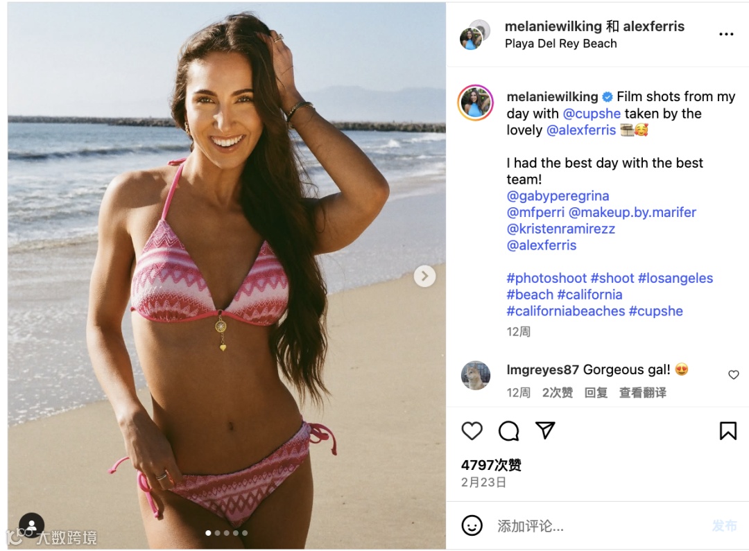 此外在社交媒体平台上,Cupshe不仅发力营销,还携手海外网红,借助他们的知名度为品牌赢得更多曝光,助力商业转化的双重飞跃。例如Instagram达人melaniewilking发布的Cupshe推广视频,就获得了4797次的点赞,吸引了大量的潜在用户的购买欲望。