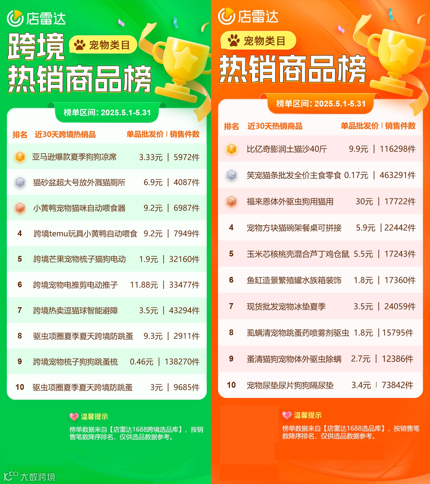 店雷达聚合1688数据推出“5月热销商品榜”,从中洞察市场趋势,为国内、跨境卖家选品、营销提供参考。本期聚焦【宠物类目】,跟着小编一起看看5月宠物赛道品类卖得好的品有哪些?可以给到宠物赛道卖家哪些选品参考?